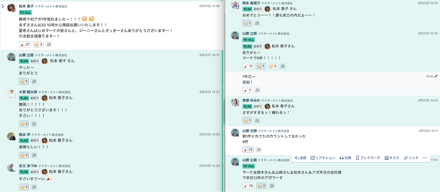 アポの報告を全社のチャットで投稿したら、他のグループのメンバーさんもリアクションをくださったり「おめでとう!」と返信をしてくださいました。