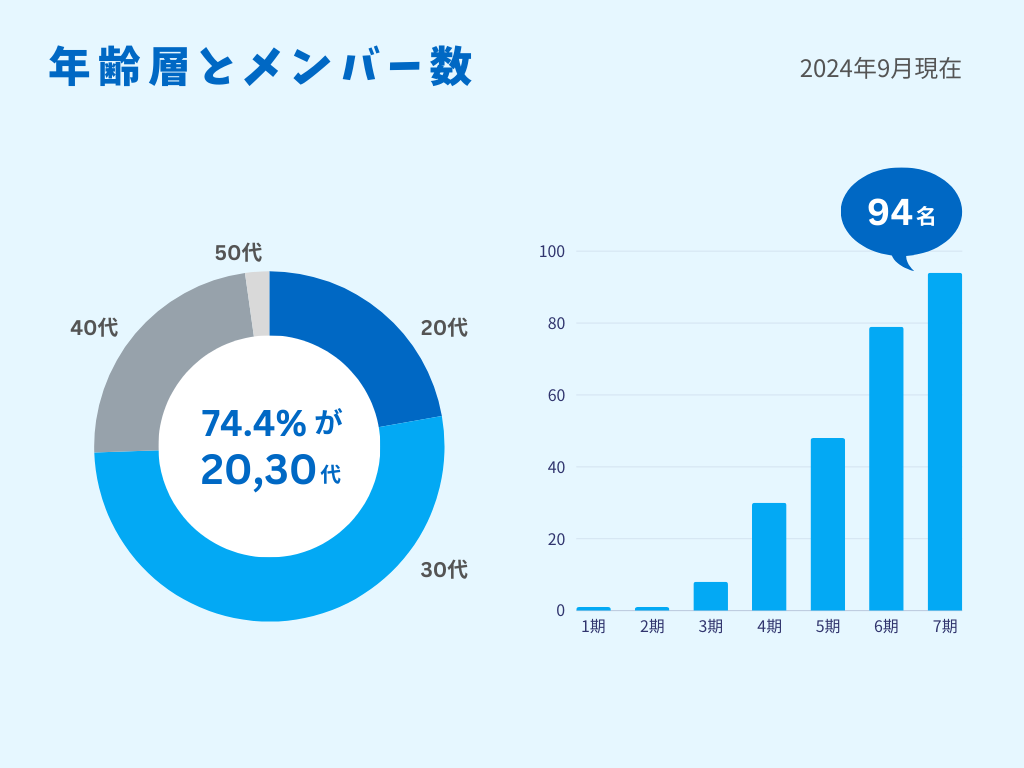1期と2期は代表の青柳以外は業務委託メンバーでしたが、7年目の現在は94人にまで増加しました!昨年からは15名増加しています。