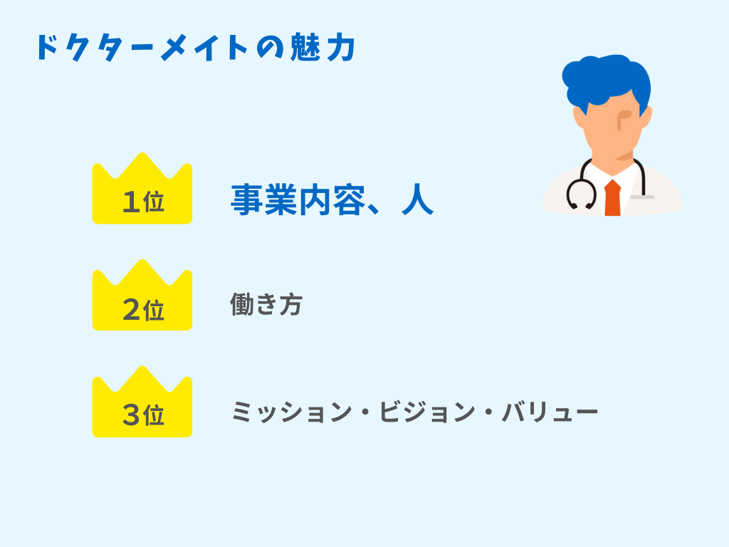 メンバーがドクターメイトで最も魅力に感じることは「事業内容」と「人」で同率でした。
