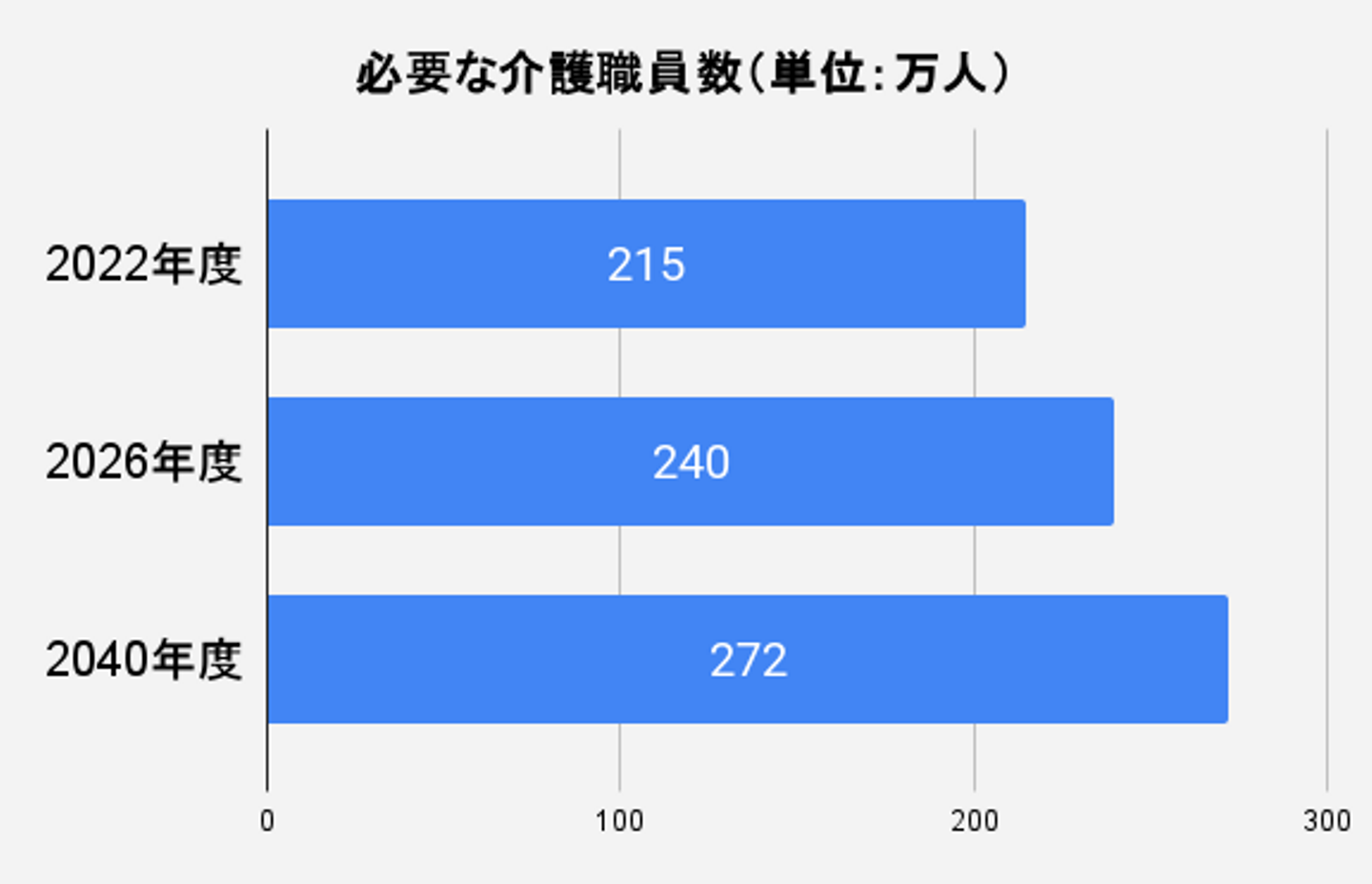 高齢者施設などでは、入居者の規模により、必要な介護職員などの人数が定められています。2022年時点で約215万人が介護職員として働いていますが、2026年度には約240万人、2040年度には約272万人の介護職員の確保が必要とされています。