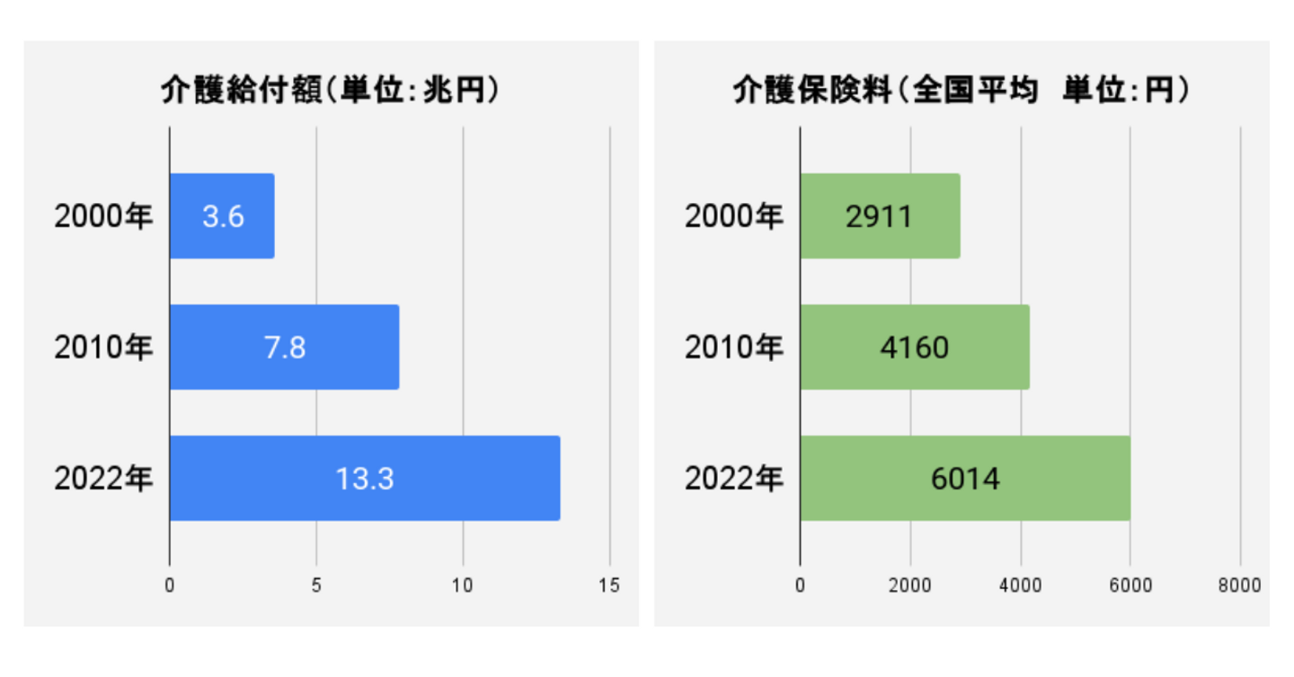 社会が負担する総費用額となる介護給付額について、介護保険創設時の2000年度は3.6兆円でしたが、その後増加の一途を辿り、2022年度には約4倍の13.3兆円に。40歳以上が負担する介護保険料も、全国平均2,911円から6,014円と約2倍になり、社会の負担も個人の負担も増加しています。