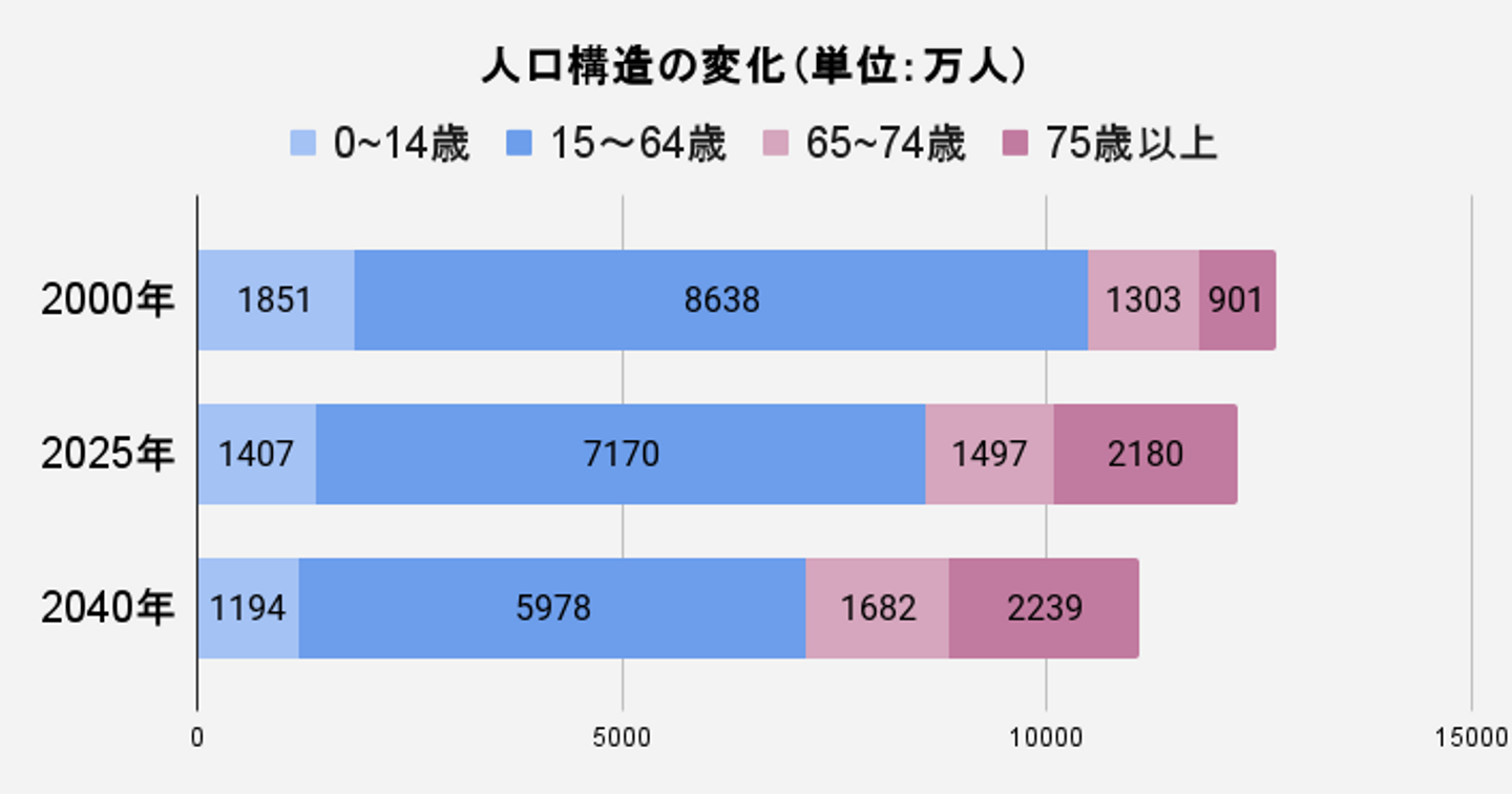 加えて、少子化の影響により、15~64歳までの「現役世代の急減」も課題となっています。2000年には8,638万人いたこの現役世代ですが、2025年には7,170万人に、2040年には5,978万人まで減少し、「少ない現役世代で多くの高齢者を支える」ことになります。