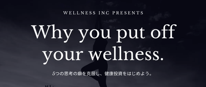 『Wellness』- それはただ病気がないこと(Health)とは異なります。 健康に対する不安がなく、自分らしく豊かに生きられる状態。 これが、Wellness(ウェルネス)です。 私たちは、病気を治す(=壊れたものを修理する)為ではなく、病気を防ぐ(=壊れないようケアする)為に医学の力を用います。 全ての人がパーソナルドクターを持ち、正しいヘルスリテラシーを身につけ、病気になる前から効率的に予防ケアを受けられる。 そんな世界を目指して、日本中にウェルネスムーブメントを巻き起こしていきます。