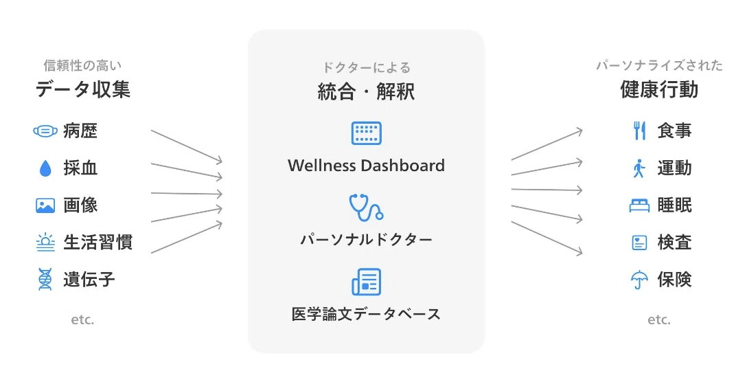 健康診断のデータや日々の睡眠データ、歩行データ、家族の病歴、現在服用中の薬やサプリメントなど、多様なデータを連携してすべてアプリで管理。パーソナルドクターがその情報を分析し、将来的な健康リスクも鑑みながら日々アドバイスを行い、最適な検査や受診すべき医療機関の提案とサポートも行います。