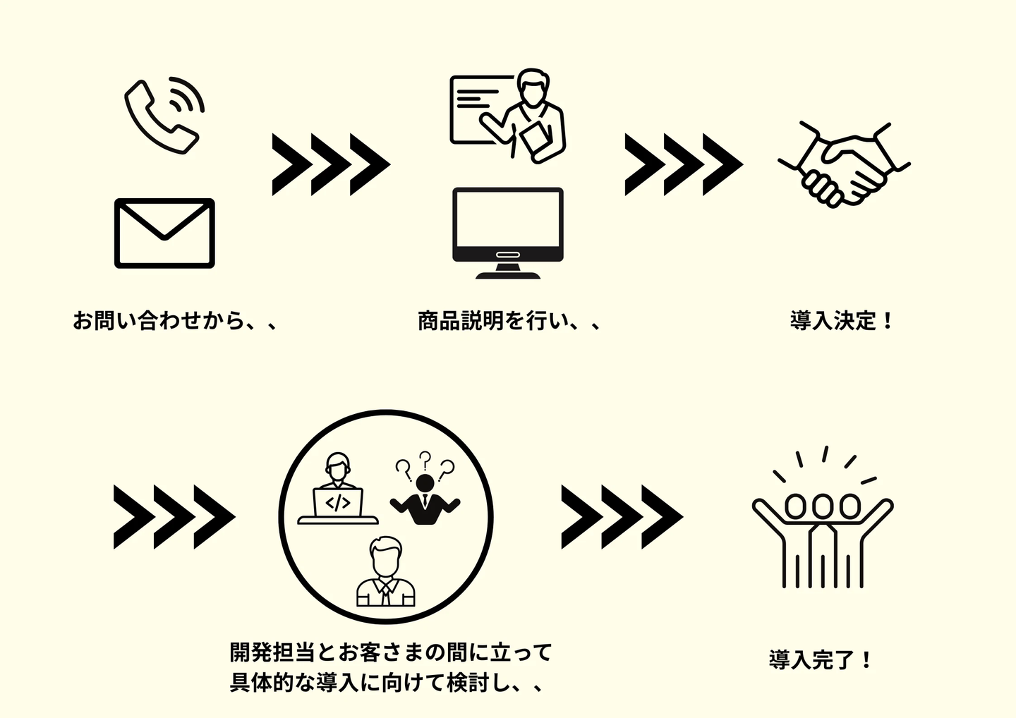 今回の場合もお客様からお問い合わせをいただき、商品についての説明やお客様へのヒアリングを行い導入を検討していただきました。