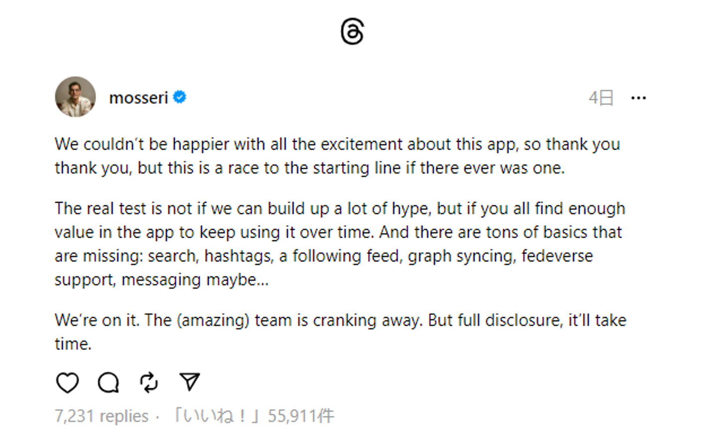 Treadsは常にユーザーの声を参考にして、アップデートを進めています。米メタ(Meta)でInstagramを率いるアダム・モッセーリ(Adam Mosseri)氏はTreads上で“フォローした人だけのリスト表示”などを開発リストにあることを明らかにしました。 他にも、検索やハッシュタグ、いいねをした投稿の一覧など様々な機能が開発リストに入っている情報があります。米メタ(Meta)でInstagramを率いるメンバーがThreads上で常に情報をアップデートしているので、確認してみると良いでしょう。