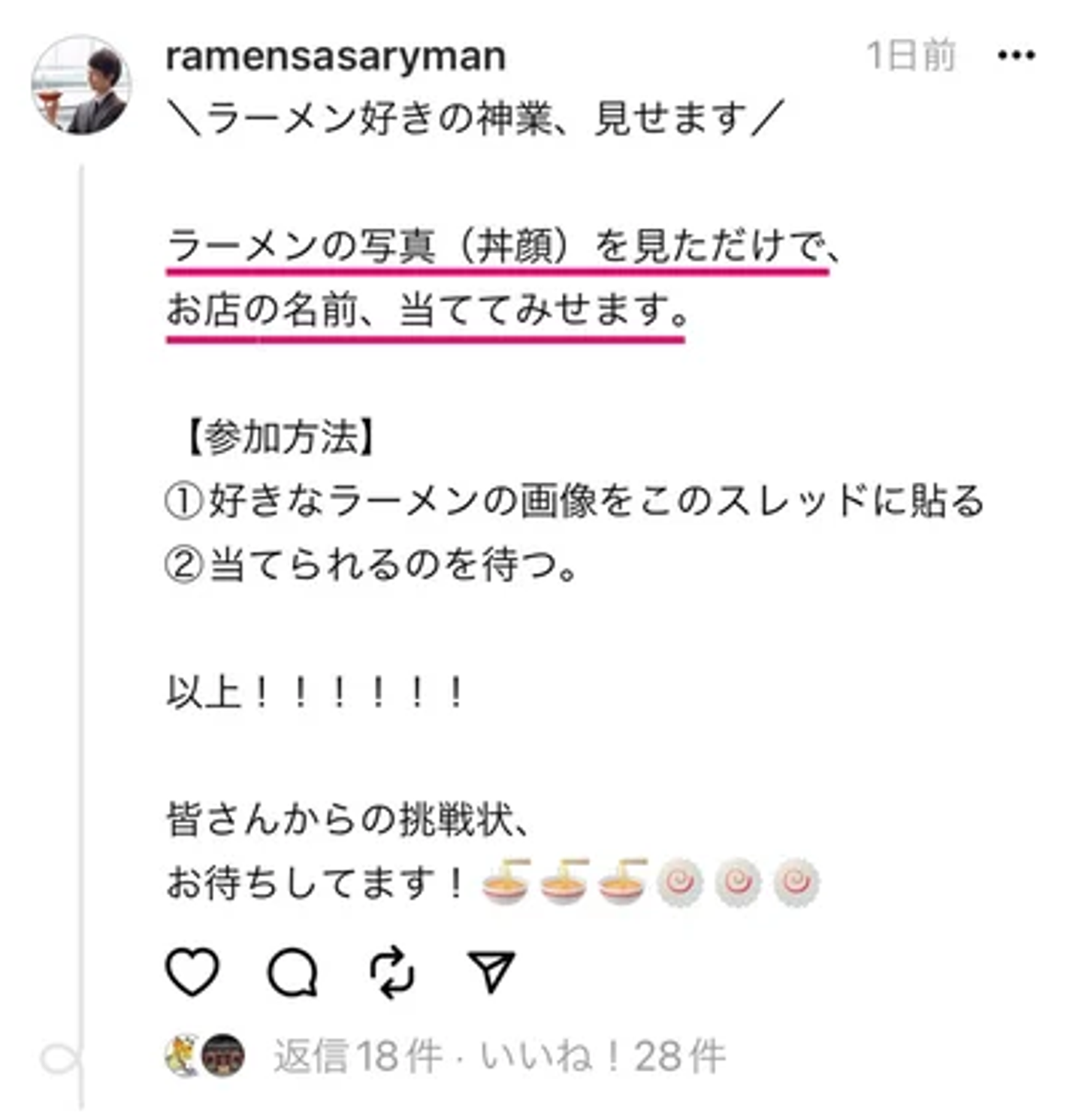 コミュニケーションが活発で、リプライが集まりやすい、といった媒体性質をいかした企画です。 Twitterではリプライをもらうことが高いポイントとなり、インプレッションが伸びやすいと言われていますが、Threadsの場合もリプライが集まることがポジティブに影響するのは間違いないでしょう。