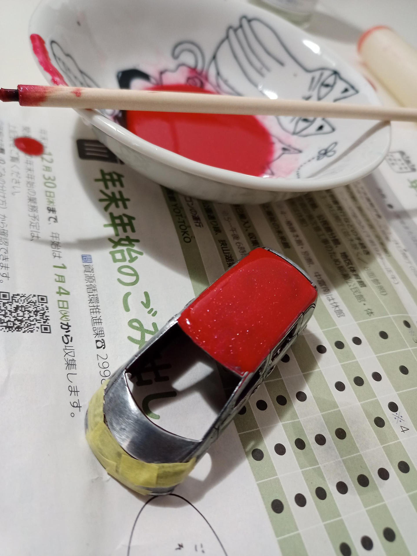 塗料剥がし液を塗ってしばらくたってから、爪楊枝で色を剥がしました。