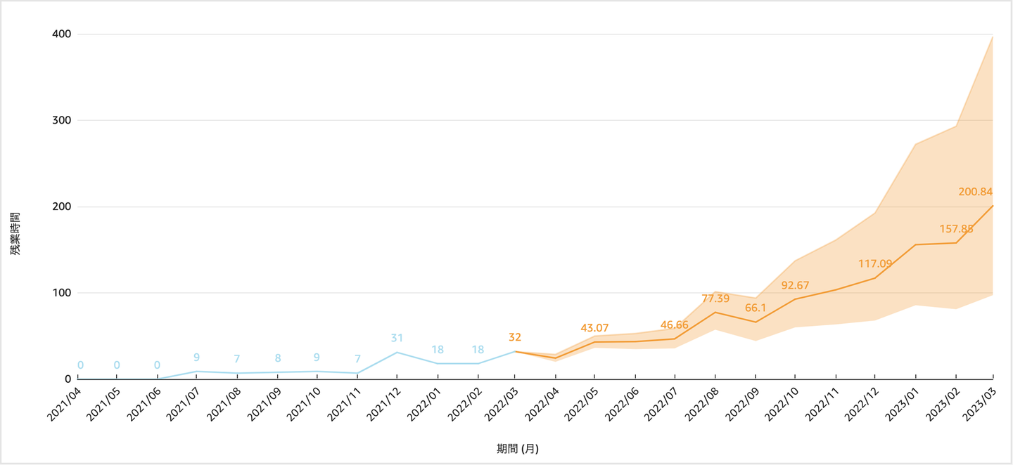 気になってしまいましたので、今年度の残業時間がどうなるかAI予測してみました。(AWS QuickSightの「予測を追加」をポチッ)