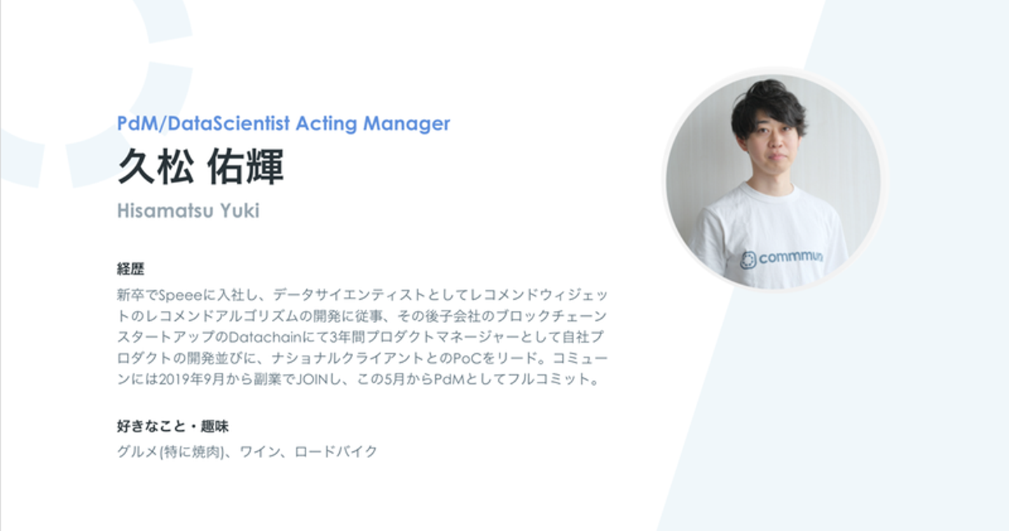 A:募集の背景について。例えばコミューンを使っていて、エンドユーザーのログインが少なくなってきたときに、次に何をすればそのコミュニティが盛り上がるのかを考えなくてはいけない。現状は担当のカスタマーサクセスマネージャーとクライアントの担当者が、これまでのノウハウをもとに頭を使って打ち手を考え、実行しているが、そこをより効率化していきたい。パターンを整理して適切なレコメンドを自動でできるようにしていく。そこで機械学習が必要。(久松)