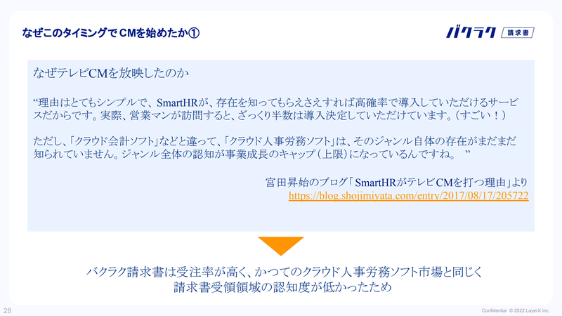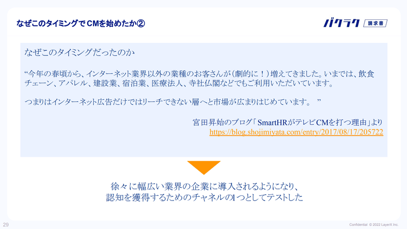 テレビCMを放映したのは、SmartHRさんがはじめてテレビCMを実施した際の状況と近しく、請求書受領領域の認知度が低くジャンル全体の認知度を上げたいと思ったことと、バクラク請求書が他のSaaSに比べて受注率が高いという点で、やってみようとなりました。
