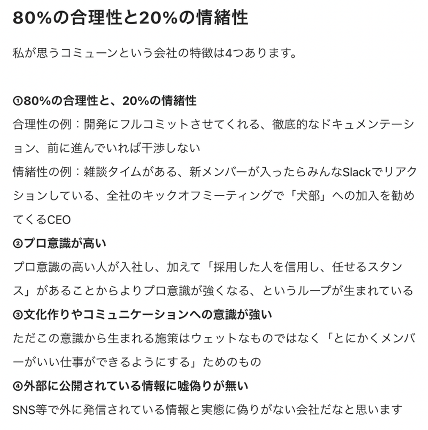 スクラムマスターの山下さんの入社エントリー。社内をリアルにイメージできる内容になっています。ちなみに、山下さんの書く文章はとても読みやすいです。笑(50人未満だった頃にコミューンを知った私は山下さんの入社エントリーを見て入社を決められた一人)