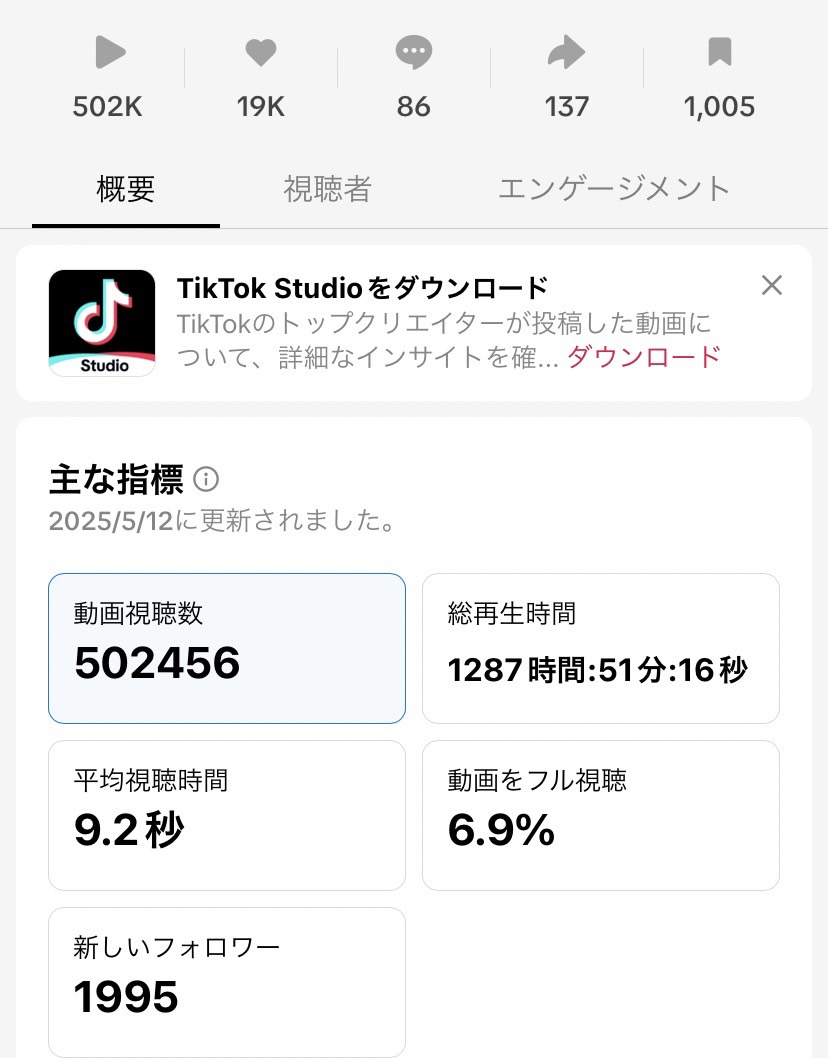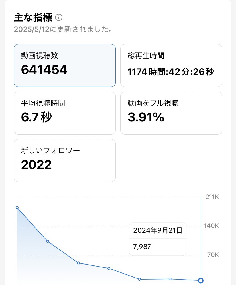 1本だけでバズっても続かないです。バズってる人は短いスパンでたくさん動画を出してます。徐々に平均視聴数が上がっていく感じです。