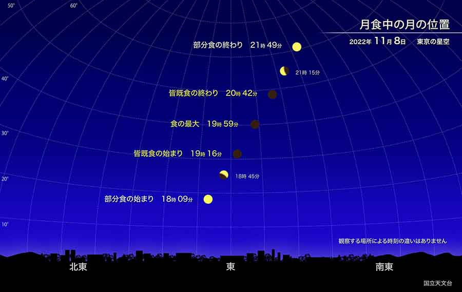 多くの地域で月の高度がある程度高くなる時間帯に皆既食となり、