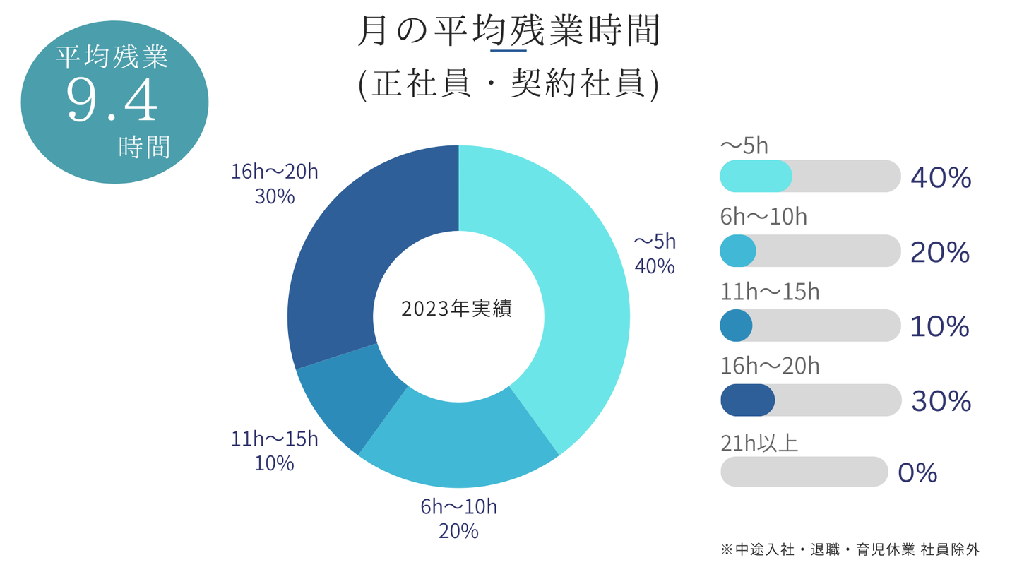 月の平均残業時間は、5時間以下が40%と最も多く、16時間~20時間が30%、6時間~10時間が20%、11時間~15時間が10%と続いてます。また、21時間以上はおりませんでした。