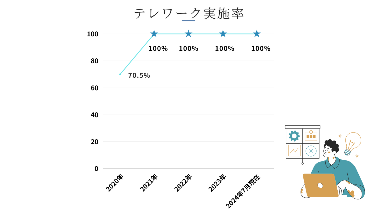 2020年9月~2024年7月現在まで、テレワーク実施率は100%です。