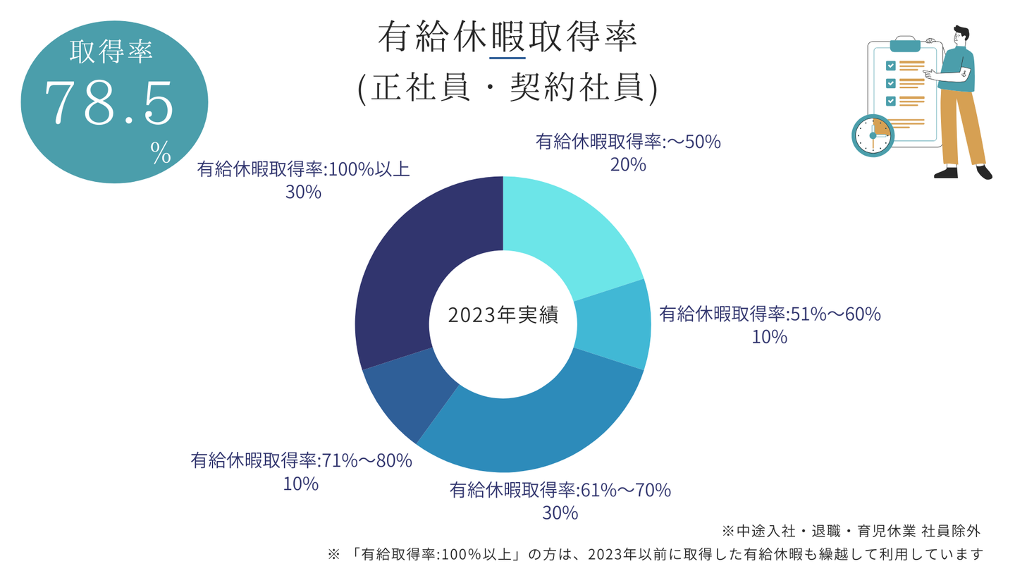 今回、2023年の実績を元に有給休暇の取得率を算出しましたところ、全体の平均有給休暇取得率は78.5%となりました。