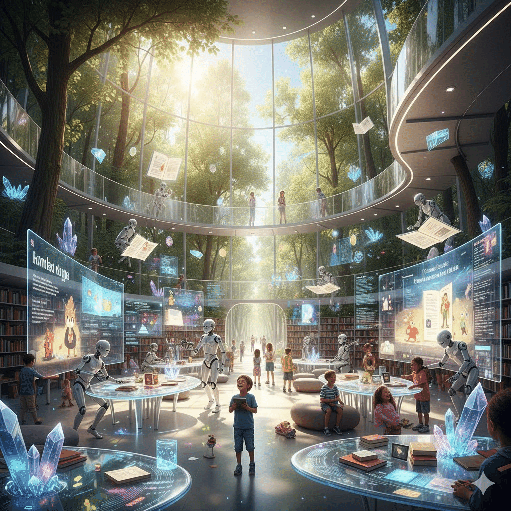 子どもたちがAIを使って描いた「未来の図書館」のサンプル画像