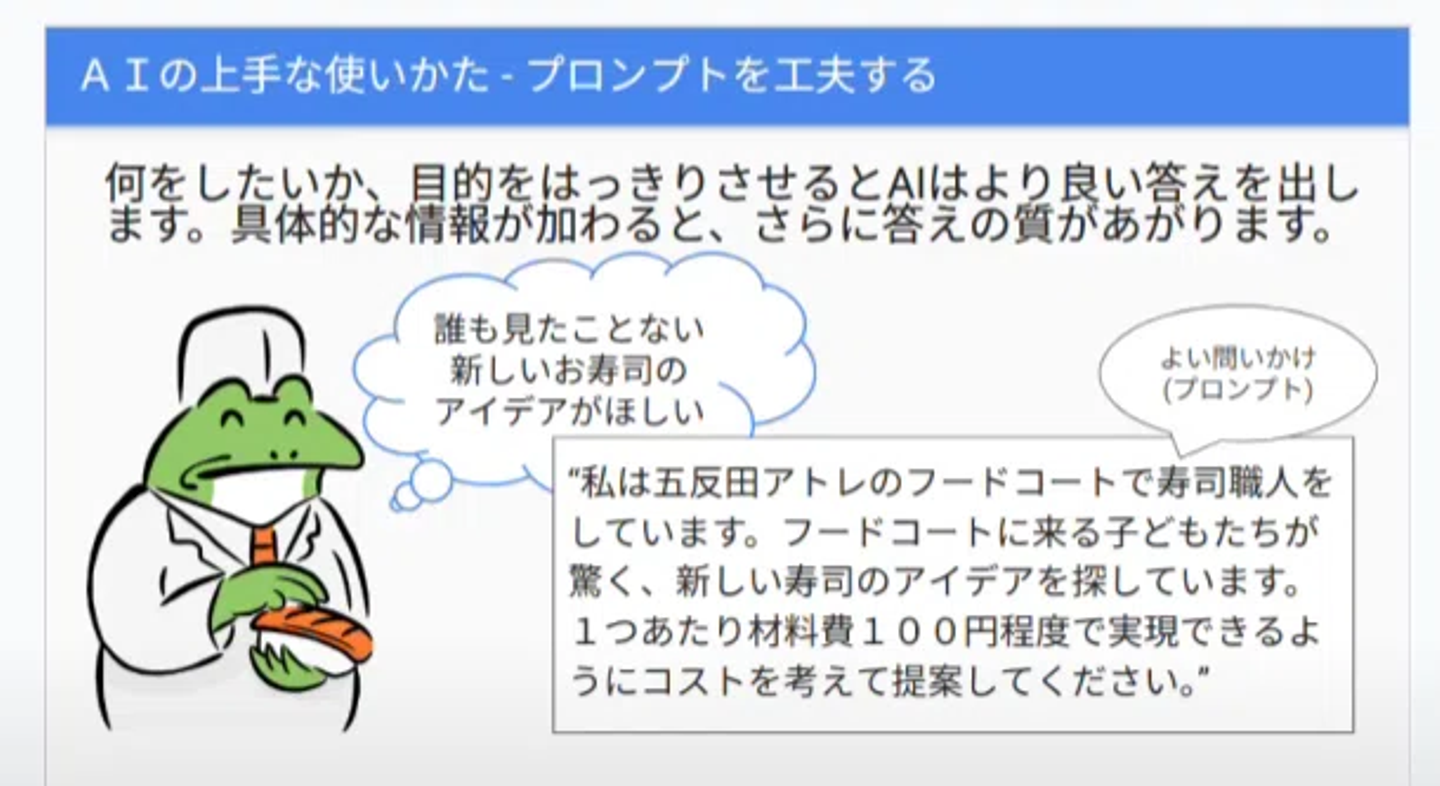 さらに、「AIには、目的を明確に伝えるほど良い回答が返ってくる」という、AIとやり取りするときの“ちょっとしたコツ”も紹介しました。