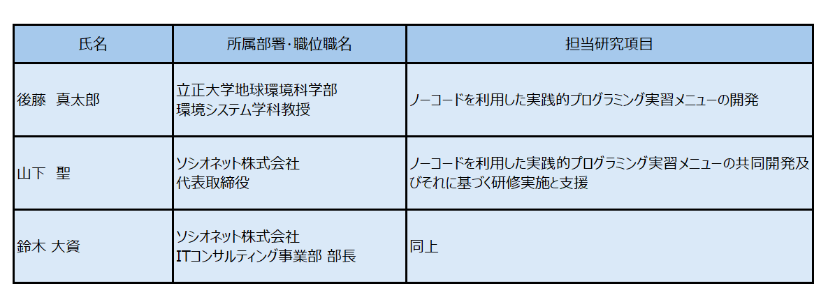 この度、ソシオネットは立正大学と「社会課題を解決するDX人材育成」を目的とした、「ノーコードを利用した実践的プログラミング実習メニューの共同開発及びそれに基づく研修実施と支援 」の共同研究をスタートさせました。