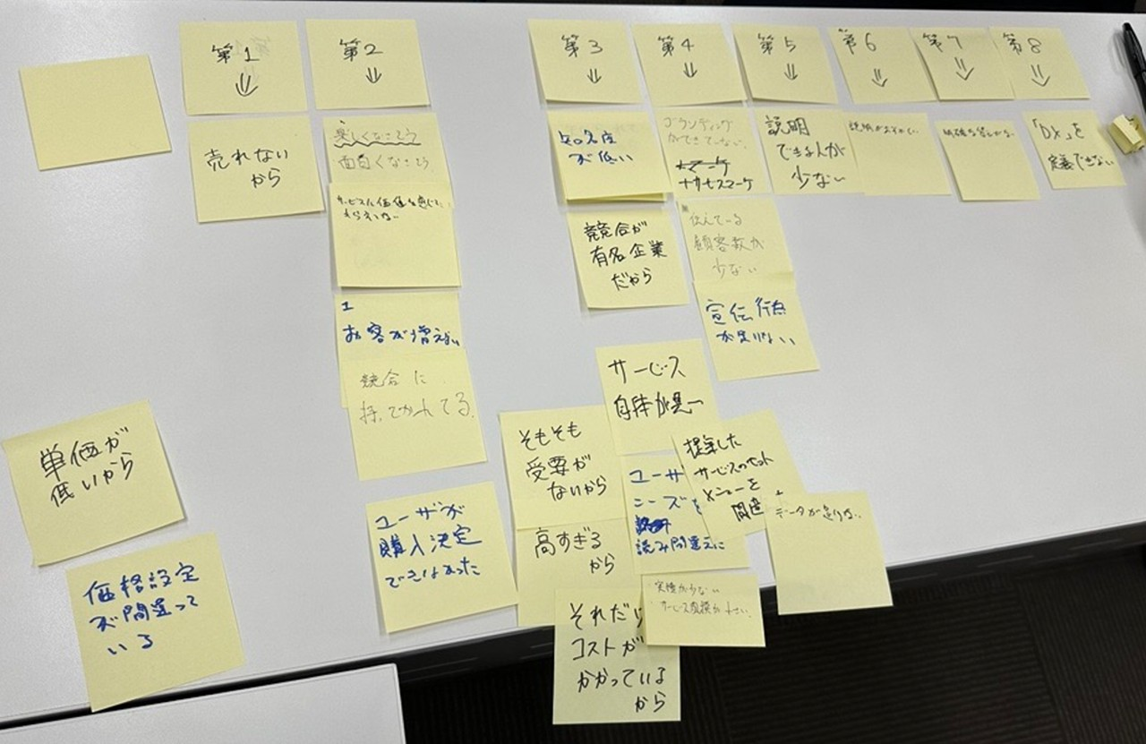 原因と結果を視覚的に整理することができ、全体の流れが一目で分かりやすくなりました。また、 ポストイットは思いついたアイデアを素早く書いて出すことができ、自由に書き換えや移動ができるため分析の手段として非常に有効的と感じました。