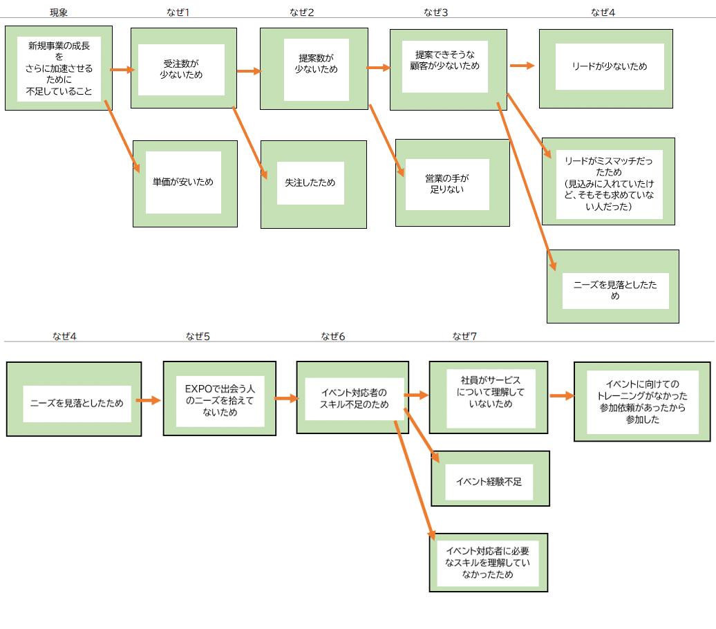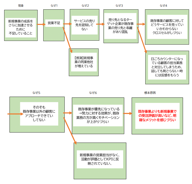 経管支援メンバーC:「“なぜ4”で『既存事業の顧客にどう売っていいか分からない』と言っているのに、“なぜ5”では『既存事業以外の顧客にアプローチしていない』という話になっていて、話が別軸になっているように感じました。そこは、因果の流れを整理して分けた方が掘り下げやすいかも。」