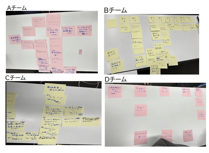 メンバーD:「提案数が少ない → 提案できる顧客が少ない → リードが少ない・ミスマッチ・ヒアリング不足……といった流れで、最終的に“イベント対応者のスキル不足”という要因に行き着きました。」
