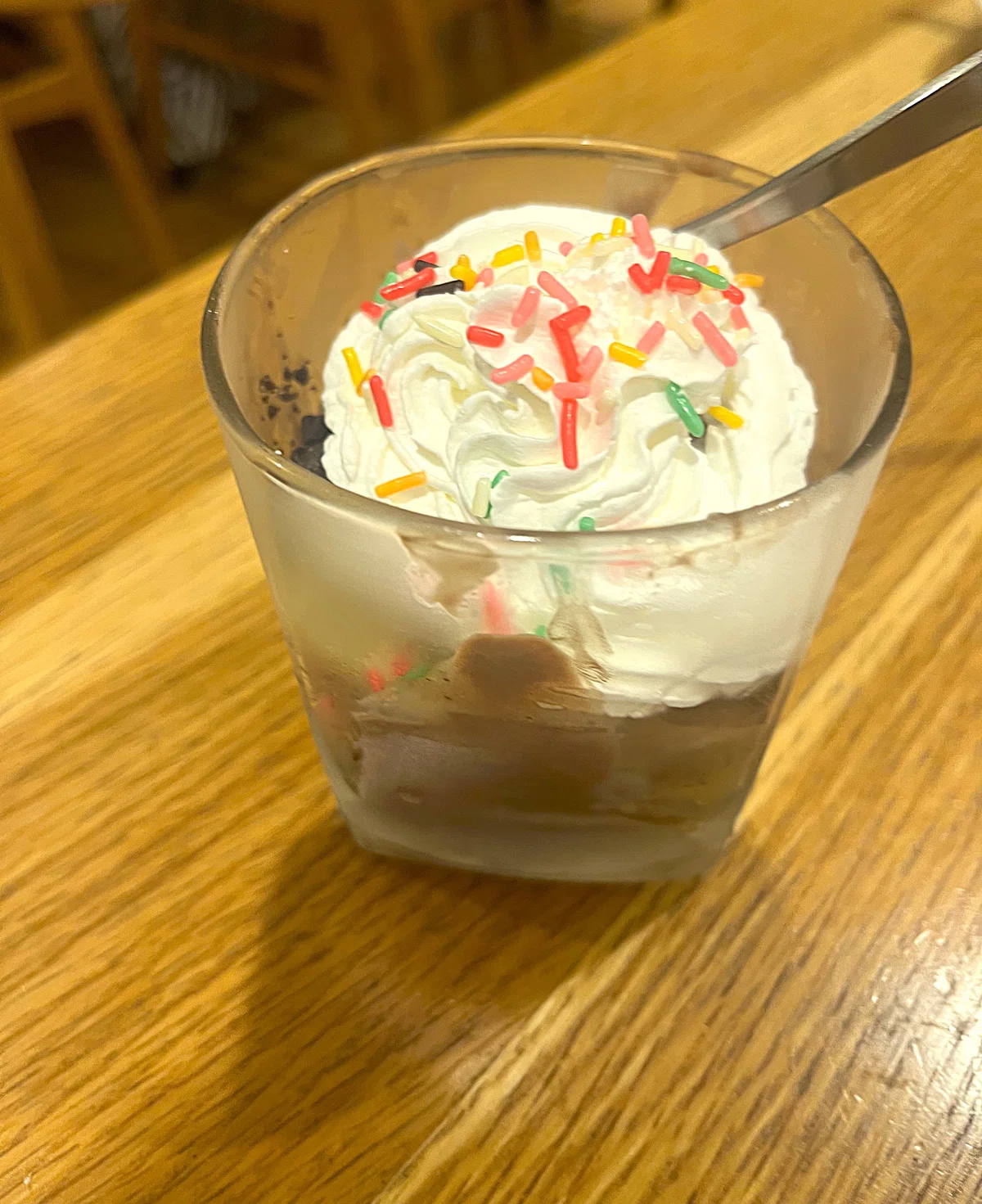 担当料理は『しめ』。しめという難しい担当でしたが、食後のデザートとしてパフェをチョイス!アイスにコーンフレーク、フルーツなどを組み合わせた本格的な仕上がりに!生クリームやチョコソースなどのトッピングはセルフ方式になっており、それぞれが思い思いの“マイパフェ”を楽しみました。