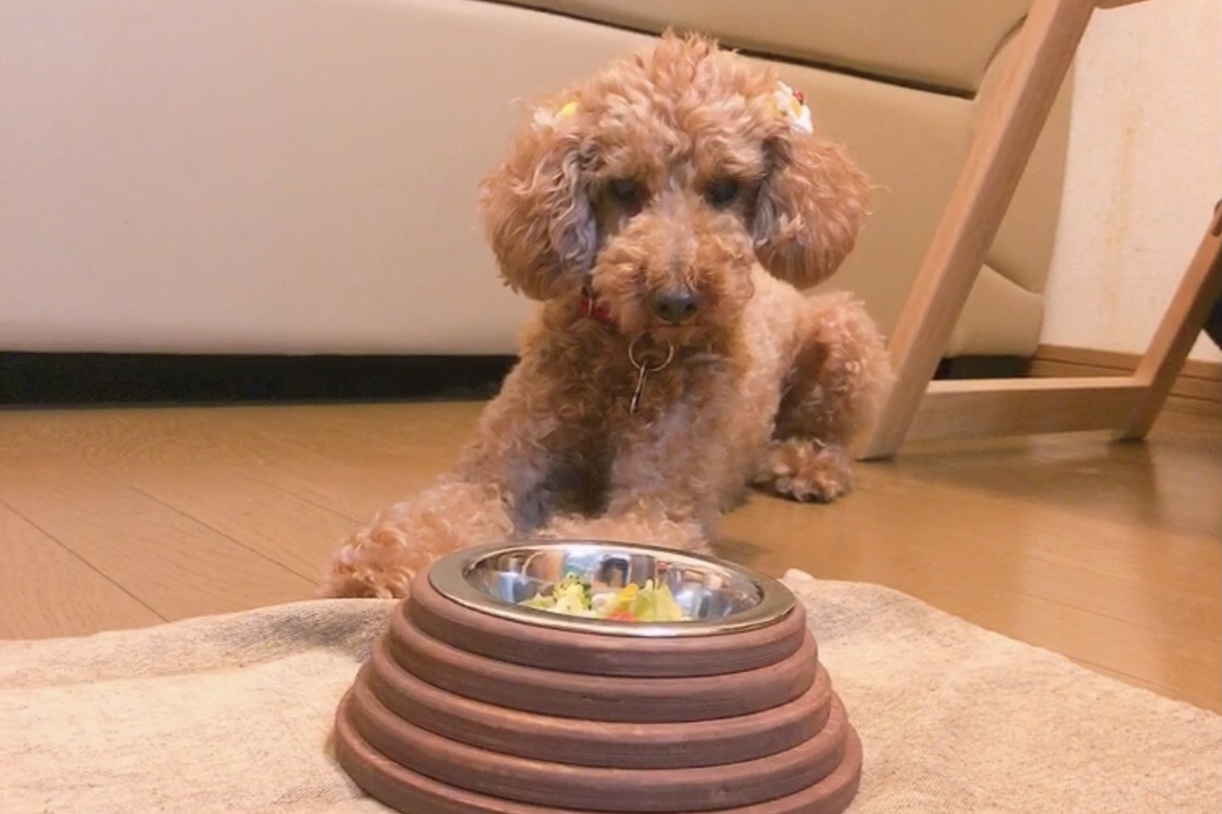 (写真は愛犬のチョコが手作りごはんを「待て」しているところ。1秒も目を逸らさずに見つめている様子を撮りました。笑)