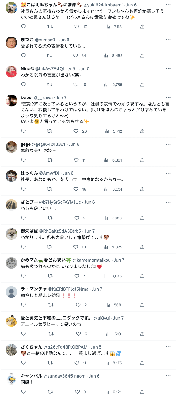 動物に真に優しくできる人はきっと人にも優しくできるはず。欧米には犬の同伴ができる会社も多いと聞いてますがこんな会社が増えてほしいなと思います。素敵な職場ですね。