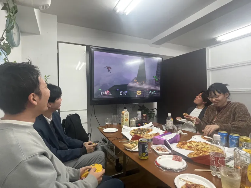ゲーム好きが集まり、ピザとお酒を楽しみながら白熱したゲームバトルが繰り広げられました。