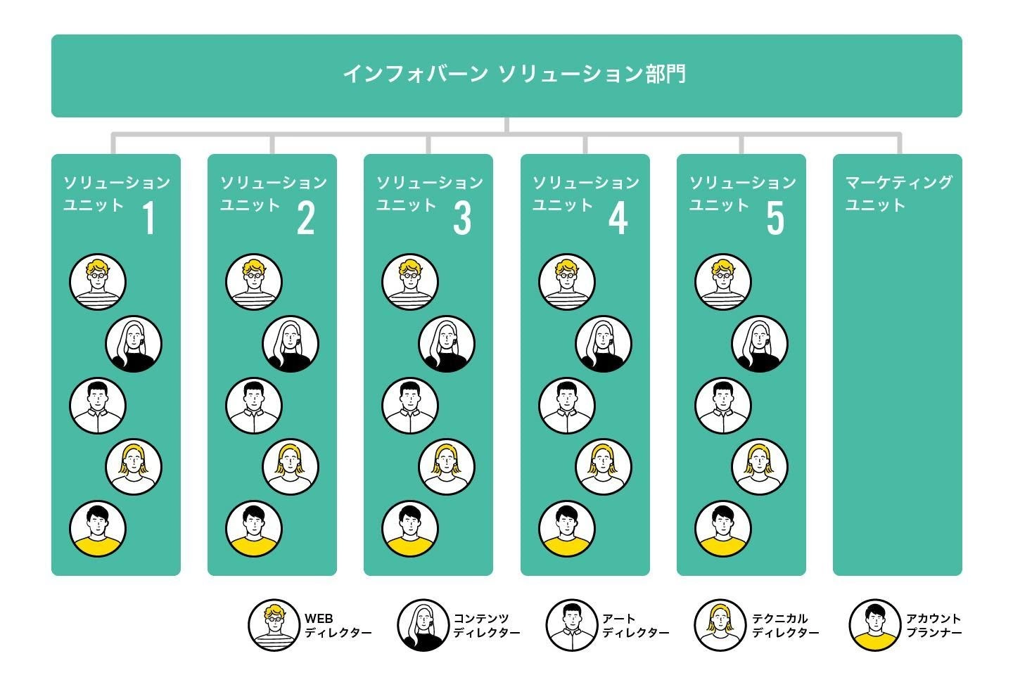 中川:均等ではないですね。運用保守案件が多いユニットにはWebディレクターが多かったり、新規の仕事を取りに行くことに比較的力を入れているユニットには、プランナー的な動きをする人が配置されていたりと特色はありますね。オウンドメディア運用を多く手掛けているところにコンテンツディレクターが多くなるなどもあります。