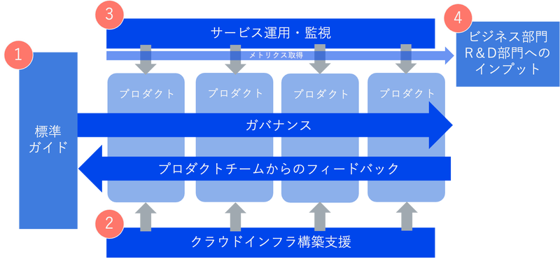 Googleが定義したSREに加えて、UPWARDではCloud Center of Excelence (CCoE)と言われているような役割をもち、クラウド利用・運用に関わるガバナンスのための標準ガイドの策定・運用プロセス整備や、ビジネスへの貢献の測定・新規機能開発のためのプロダクト利用状況の測定並びにITコストの可視化の整備を進めています。(図2)。