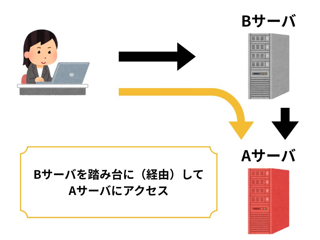 この場合に、あなたはBサーバに接続してからAサーバに接続します。このときのBサーバが踏み台サーバにあたります。