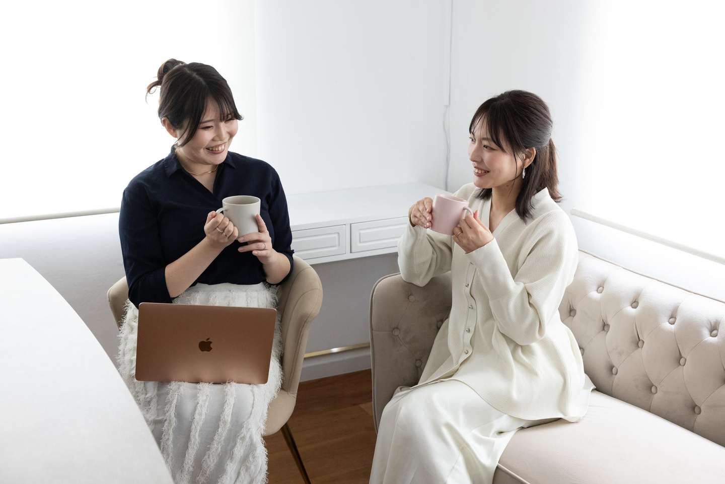 当日は、終始和やかなムード。メンバー同士で 「前回の撮影と雰囲気変わったね!」「ヘアスタイルによってイメージがすごく違って良いね!」「このリップどこの?」といった会話が飛び交いながら、リラックスした雰囲気で撮影が進みます。