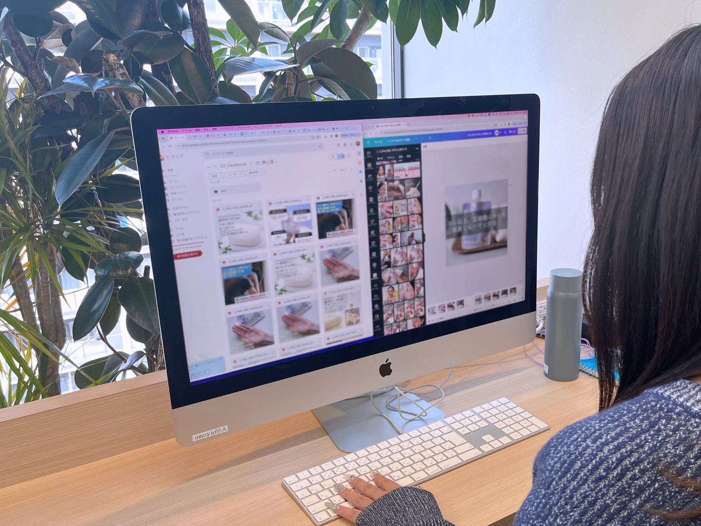 まず朝いちばんにすることは、どの広告がどれくらいの人に見られているか、どんな広告が伸びているかなど数値確認をしています。私は主にFacebookの数値を見ています。データをみた後は、その数値から分析して、どの広告がお客さんの目に留まっているか、結果につながる広告にするにはという点を考えます。そしてその改善案やいいと思う部分についてを担当の社員に提出し、フィードバックをもらっています。