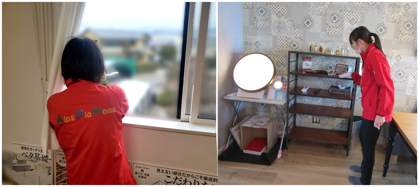 まず、見学会会場であるお家の掃除をスタッフ自ら丁寧に行います。とある先輩スタッフは「お家づくりに夢をもっていらっしゃるお客様の想いを壊さないように」とも言っていました。