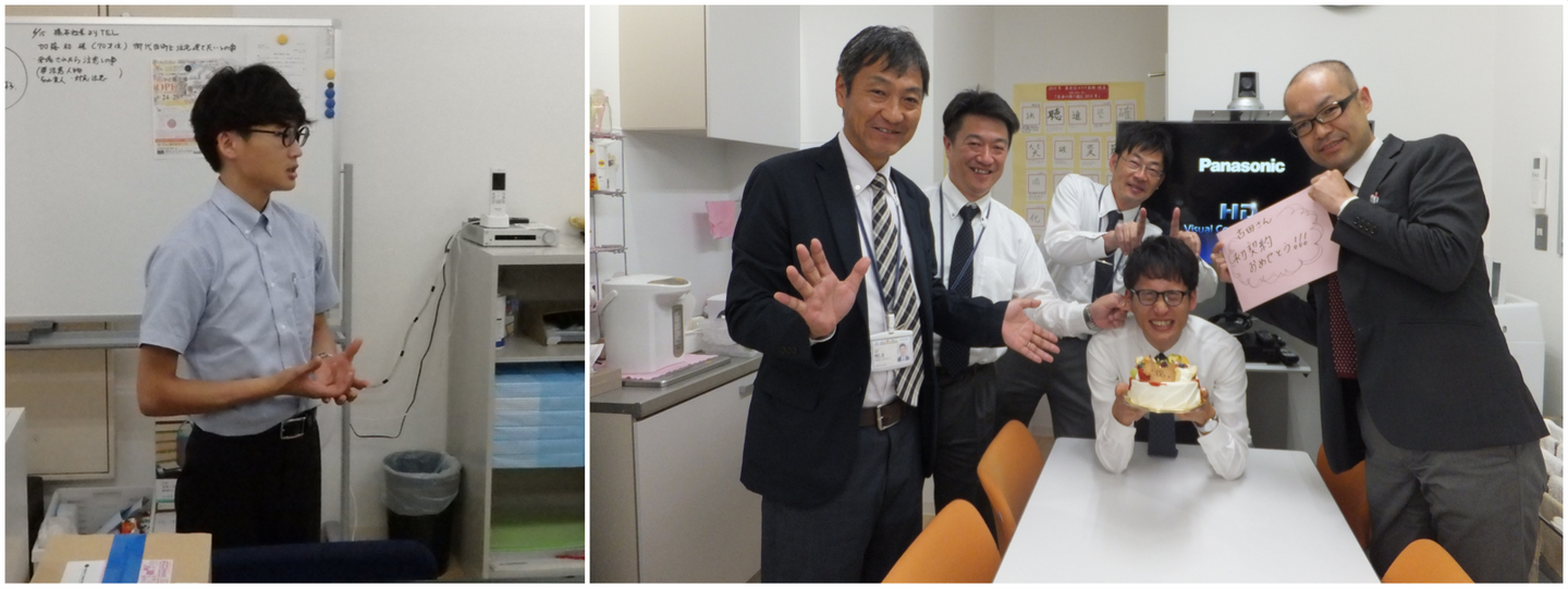 (左:配属当初の古田さん 右:初契約をお祝いしてもらう古田さん)
