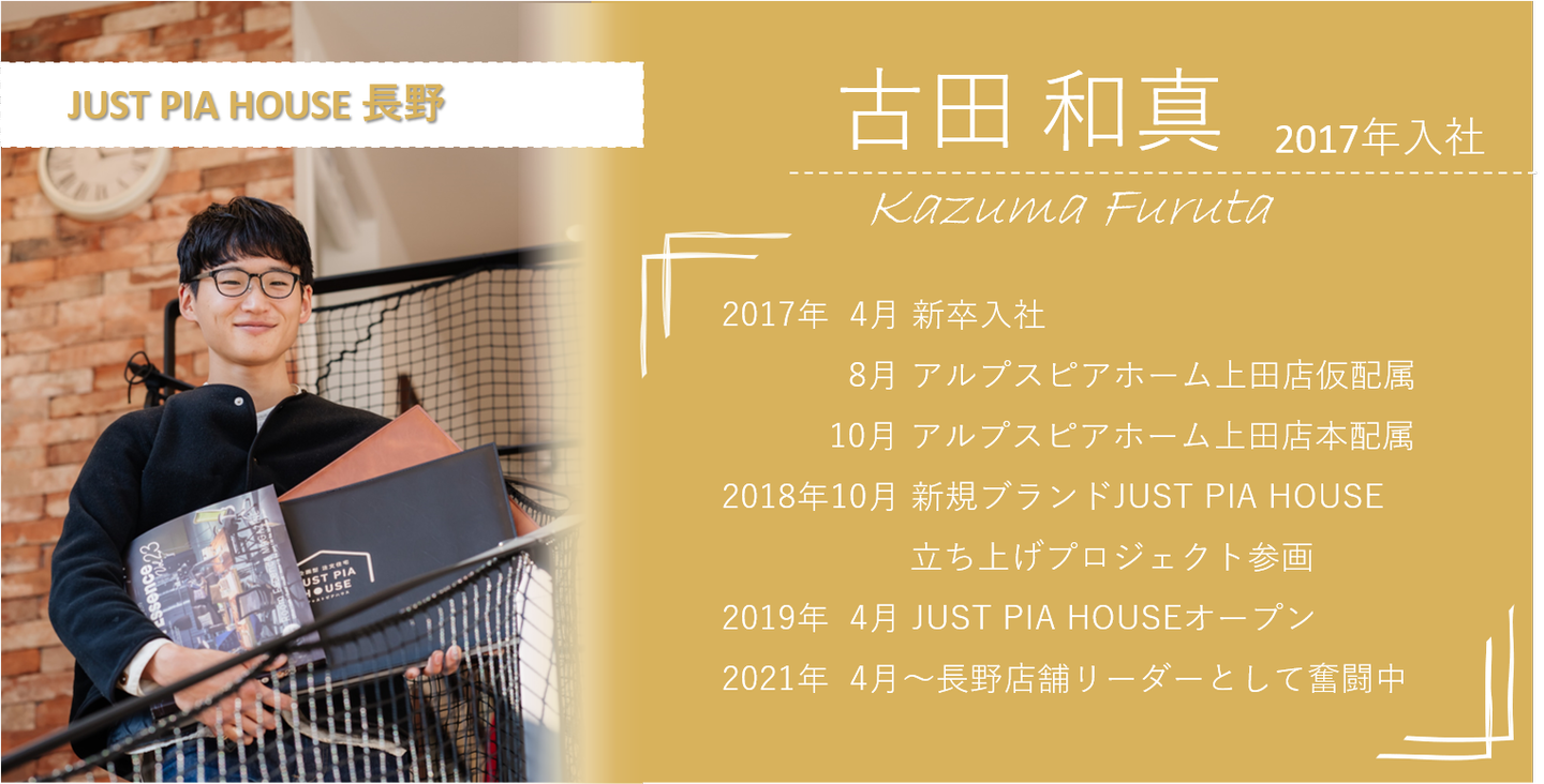今回お話を伺ったのは、JUST PIA HOUSE(ジャストピアハウス)長野の古田和真さん。新卒2年目にJUST PIA HOUSEという当時新ブランドの立ち上げメンバーに新卒スタッフで初めて選ばれ、今では長野店リーダーとして活躍する注目の若手スタッフです。インタビューの中では「就活当時は生意気だった」と苦い表情で語った古田さん。そんな古田さんはなぜAPHを選んだのか?どこに魅力を感じ、入社5年目に差し掛かった今どんなことを思うのか?インタビューから見えたのは、就活当時も現在も全力で“今“にぶつかってきた姿でした!