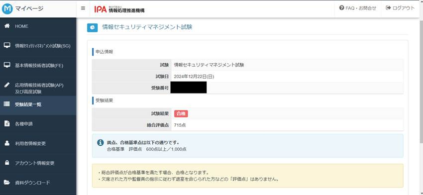 下記キャプチャの通り、7割超の点数で合格することができました。試験終了後、約3時間後にはipaのマイページにてスコアを確認することはできました。正式な合格発表は翌月に回されました。