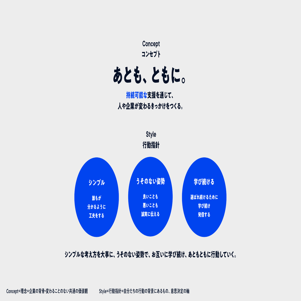 コンセプトは、「あとも、ともに」です。サブメッセージとして、持続可能な支援を通じて人や企業が変わるきっかけをつくる。このコンセプトを実現するために、「アトモニに関わる人すべての人の判断基準となる背骨を決める」ことをしていきます。人が増えていくと、阿吽の呼吸で済んでいたところも難しくなってくると思ったため、今期はしっかりと判断基準を決め手いきます。