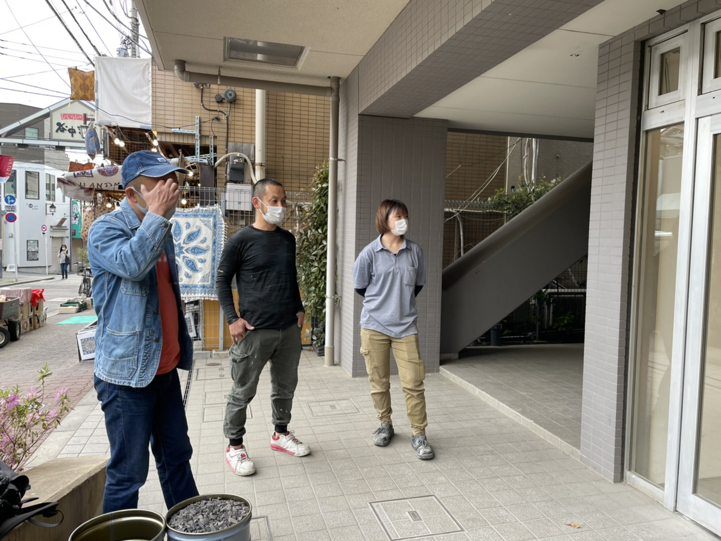 左から福ベーグルの福島社長、原田左官のNさん、Dさんです。