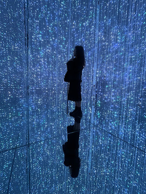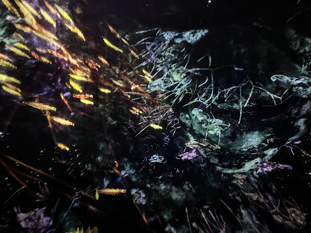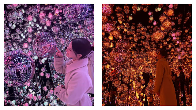 近くにいた観光客の方の写真の撮り方があまりにもお上手だったので真似してみました😎光の点描に包まれた空間ですが、思わず自分が海の中を泳ぐ魚の群衆の一匹になったかのような気分を味わうことができます🐟ふっと光と音がなくなり暗闇になる瞬間があり、そのシーンとした雰囲気がより幻想的な空間を際立たせます🌌
