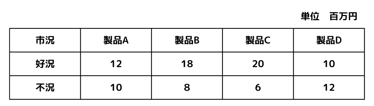 X社では来期に製品A、B、C、Dいずれか一つを市場に投入することを検討している。来期の市場で好況の確率は40%、不況の確率は60%と予想され、市況ごとの各製品の予想売上高が表のとおりであるとき、この市場から得られる最大の売上期待値をもたらす製品はどれか。