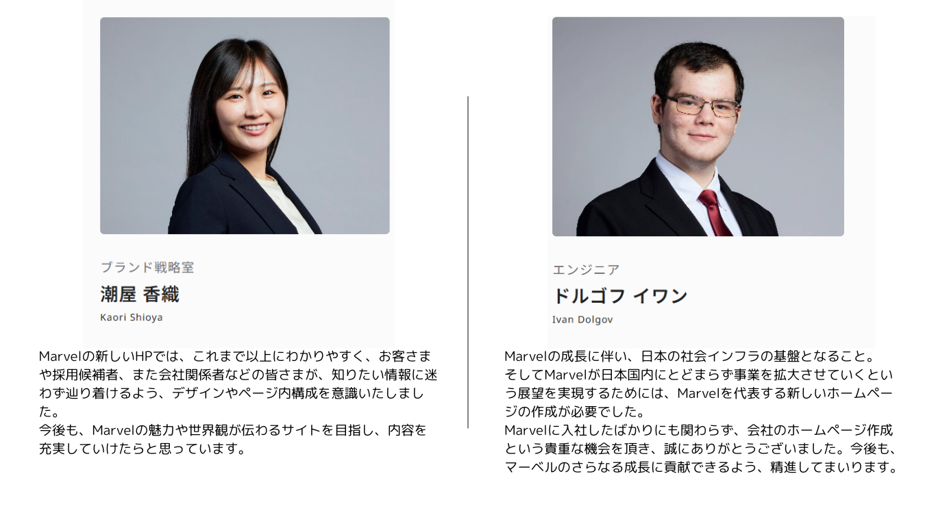 既存のホームページから、より「Marvel株式会社」という世界観の統一を図り、Marvelの想いやビジョン、ミッションをさらに明確にお伝えしていくため、リニューアルをする運びとなりました。