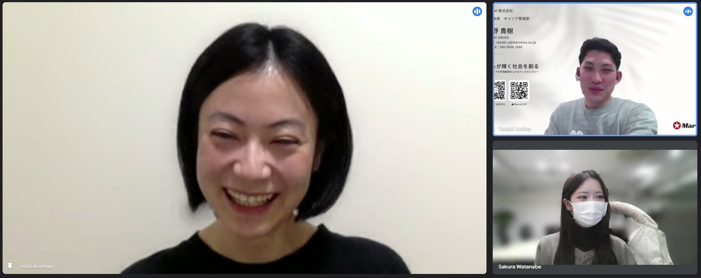 オンラインで、エンジニアの越谷さん、キャリア管理部(エンジニアのキャリアをサポートする専門部署)の海野さん、広報の渡邊の3者の対談式でインタビューを実施。