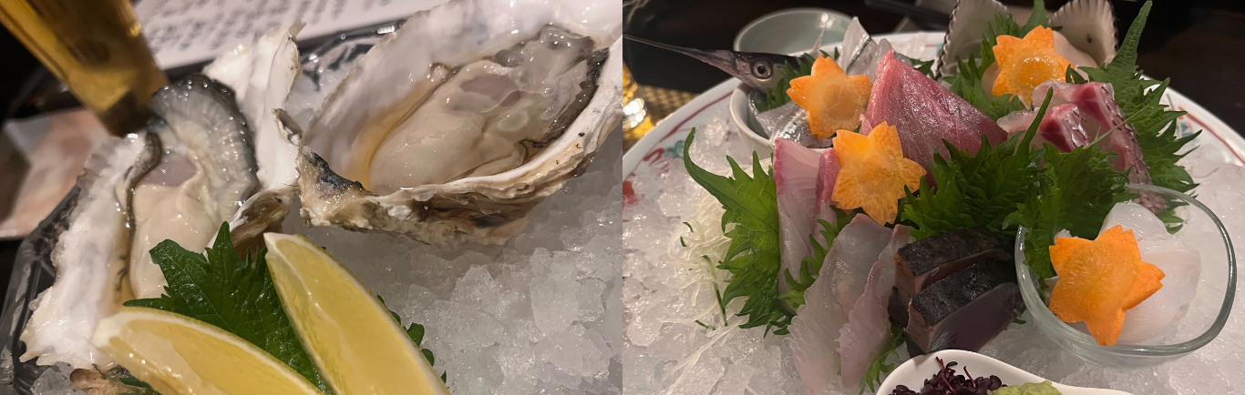 網元から直接仕入れ、毎日魚の種類が変わる新鮮なお刺身と、おかみさんおすすめの生牡蠣をいただきました。彩りの良い盛り付けと、その日に入荷したみずみずしく旨みたっぷりなお刺身はお酒によく合います🍶