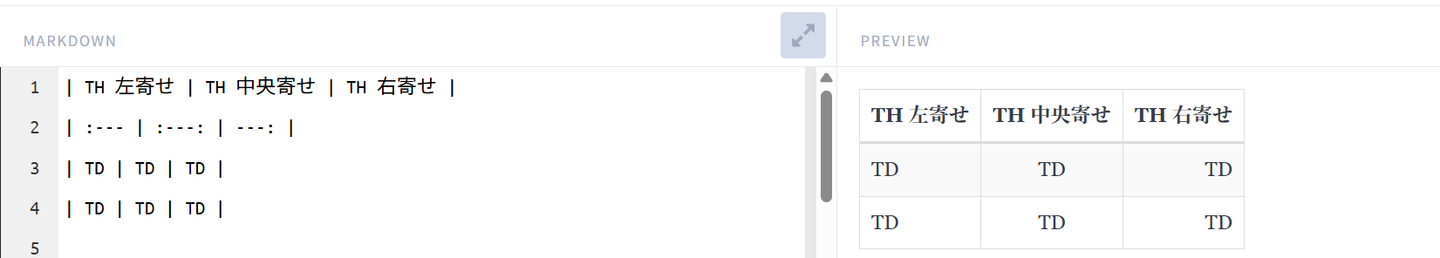 ・区切り行の「---」と「:(コロン)」を使って、データの配置方法を指定する。