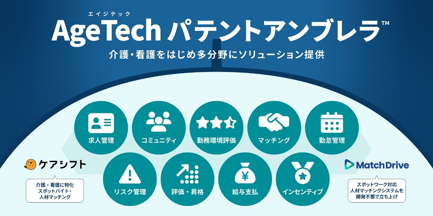 AgeTechは、高齢社会の課題をテクノロジーで解決する取り組みの総称です。当社の「AgeTechパテントアンブレラ」は、AgeTech領域の現場起点の個別技術・要素を複数の特許に再構成し、当社の「マッチドライブ」(スキマバイト対応人材マッチングシステムを自社ブランドで簡単構築できるサービス)や「ケアシフト」(介護・看護向けスキマバイトサービス)を守る仕組みです。