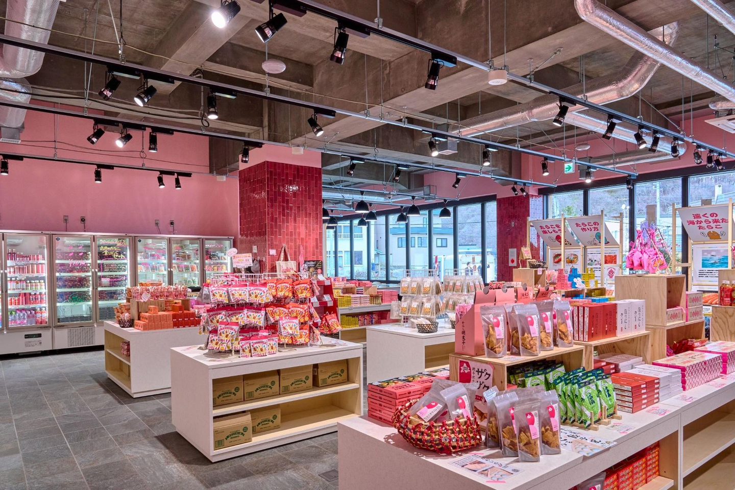 たらこが主役の鮮やかなピンクを基調とした館内では、たらこと古平の歴史を学べるパネルやユニークなアート作品を展示。地元事業者と連携し、複数の生産者のたらこをぎゅっと詰め合わせた食べ比べセットや手軽に楽しめるスナック菓子などのオリジナルの物販商品を企画からデザインまで一貫して開発。たらこが楽しめる飲食メニューも揃えました。